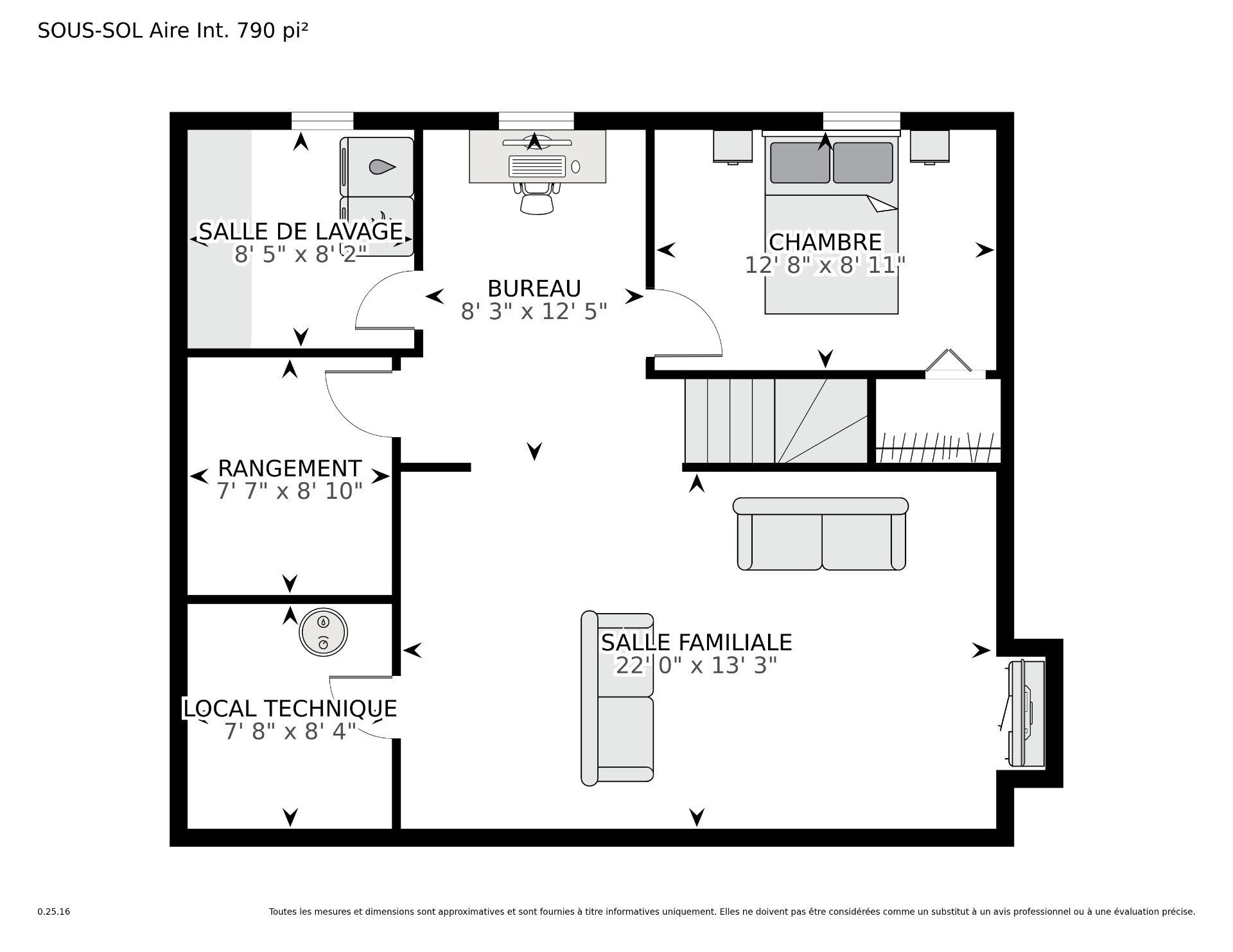 | Boudoir | 12.5 x 8.1 P | Sous-sol | Couvre-sol souple |